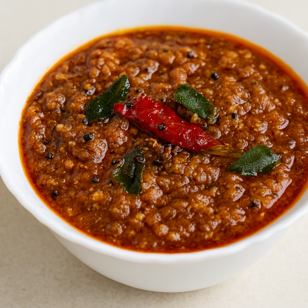 Key Ingredients: Finely chopped fresh ginger, tamarind pulp, and jaggery. Flavor Profile: A powerful “four-dimensional” taste experience that is simultaneously spicy, sour, sweet, and salty. Aromatic Base: Tempered in sesame oil (gingelly oil) with mustard seeds, dry red chilies, fenugreek, and plenty of fresh curry leaves. Texture: Varies from a thick, jam-like consistency with bits of sautéed ginger to a smooth, dark-brown saucy relish. Cultural Significance: Often referred to as “the equal of a hundred curries” because of its potent flavor and medicinal properties.